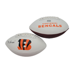 This Bengals Logo Football was personally hand signed by Ja'Marr Chase in black marker. The Football was signed in the presence of Beckett Authentication Services and comes affixed with a individual Witnessed numbered tamper-evident hologram. The Football also comes with a Famous Ink hologram guaranteeing authenticity for life. Domestic ground shipping for this item is FREE to the contiguous 48 states. Please contact us for International and other shipping options.