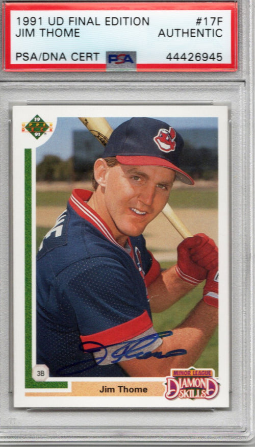 This 1991 Upper Deck Rookie Trading Card was personally hand signed by Jim Thome in blue marker. The Card is authenticated and encapsulated by PSA/DNA. Domestic ground shipping for this item is FREE to the contiguous 48 states. Please contact us for International and other shipping options.