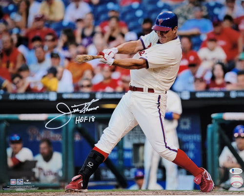 This Licensed 16x20 photo was personally hand signed by Jim Thome in white paint marker with the inscription "HOF 18". The photo was signed in the presence of a Beckett Authentication Services Representative and comes affixed with a witnessed individual numbered tamper-evident sticker and matching Certificate of Authenticity card. The photo also comes with a Famous Ink hologram guaranteeing authenticity for life. Domestic ground shipping for this item is FREE to the contiguous 48 states. Please contact us for International and other shipping options.