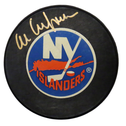 This Islanders Logo Hockey Puck was personally hand signed Al Arbour in silver paint marker. The puck is Authenticated by JSA and comes affixed with a individual numbered tamper-evident sticker and matching Certificate of Authenticity card. The puck also comes with a Famous Ink hologram guaranteeing authenticity for life. Domestic ground shipping for this item is FREE to the contiguous 48 states. Please contact us for International and other shipping options.