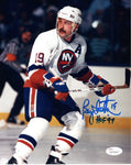 This 8x10 Photo was personally hand signed Bryan Trottier in blue marker with the inscription "HOF 99". The photo was signed in the presence of JSA and comes affixed with a individual numbered tamper-evident sticker and matching Certificate of Authenticity card. The photo also comes with a Famous Ink hologram guaranteeing authenticity for life. Domestic ground shipping for this item is FREE to the contiguous 48 states. Please contact us for International and other shipping options.