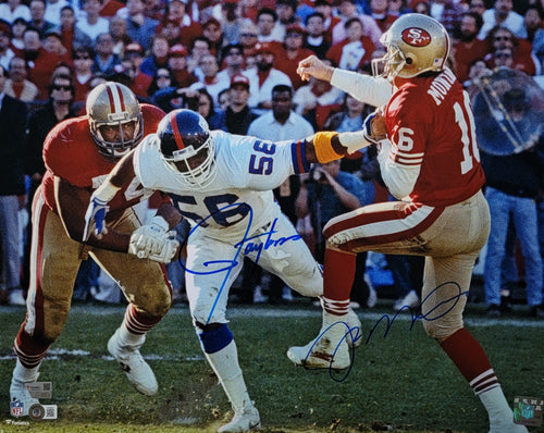 This Licensed 16x20 was personally hand signed by Joe Montana & Lawrence Taylor in blue marker. The Photo was signed in the presence of a Beckett Authentication Services Representative and comes affixed with a witnessed individual numbered tamper-evident hologram. The Photo also comes with a Famous Ink hologram guaranteeing authenticity for life. Domestic ground shipping for this item is FREE to the contiguous 48 states. Please contact us for International and other shipping options.
