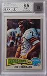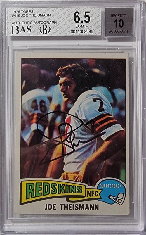 This 1975 Rookie Trading Card was personally hand signed by Joe Theismann in black marker. The Card is authenticated and encapsulated by Beckett Authentication Services. The card is Graded 6.5 and the autograph is 10. The Card also comes with a Famousink hologram guaranteeing authenticity for life. Domestic ground shipping for this item is FREE to the contiguous 48 states. Please contact us for International and other shipping options.