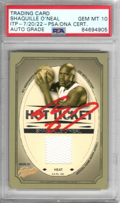 This 2004 Fleer Hot Ticket Game Worn Jersey Trading Card was personally hand signed by Shaquille O'Neal in red paint marker. The Card is AUTO GRADED GEM MINT 10 and encapsulated by PSA/DNA. Domestic ground shipping for this item is FREE to the contiguous 48 states. Please contact us for International and other shipping options.