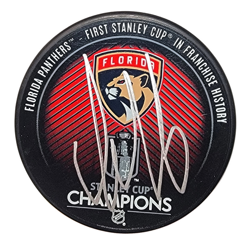 This 2024 Florida Panthers Stanley Cup Champions Hockey Puck was personally hand signed by Aleksander Barkov in silver paint marker. The Puck is Authenticated by Beckett Authentication Services and comes affixed with a individual numbered tamper-evident hologram. The Puck also comes with a Famous Ink hologram guaranteeing authenticity for life. Domestic ground shipping for this item is FREE to the contiguous 48 states. Please contact us for International and other shipping options.