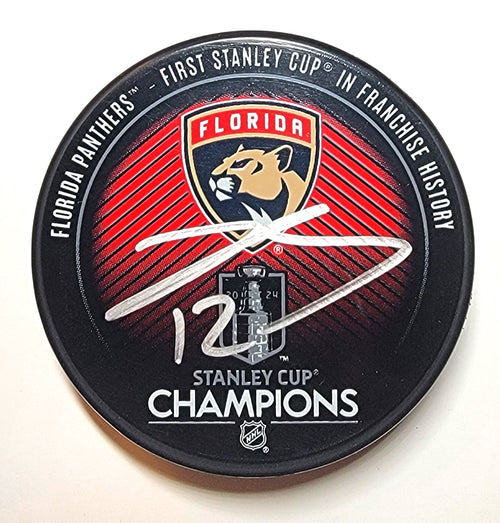 This Florida Panthers 2024 Stanley Cup Champions Hockey Puck was personally hand signed by Jonah Gadjovich in silver paint marker. The Puck was Authenticated by Beckett Authentication Services and comes affixed with a individual numbered tamper-evident hologram. The Puck also comes with a Famous Ink hologram guaranteeing authenticity for life. Domestic ground shipping for this item is FREE to the contiguous 48 states. Please contact us for International and other shipping options.