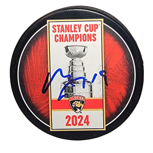 This 2024 Florida Panthers Stanley Cup Champions Banner Hockey Puck was personally hand signed by Matthew Tkachuk in blue marker. The Puck was signed in the presence of a Beckett Authentication Services Representative and comes affixed with a individual numbered tamper-evident hologram. The Puck also comes with a Famous Ink hologram guaranteeing authenticity for life. Domestic ground shipping for this item is FREE to the contiguous 48 states. Please contact us for International and other shipping options.