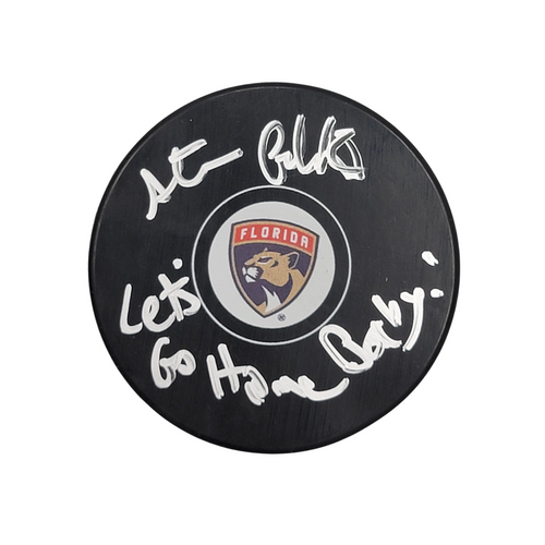 This Florida Panthers Logo Hockey Puck was personally hand signed by Steve Goldstein in silver paint marker With his trademark "Lets Go Home Baby". The Puck was Authenticated by Beckett Authentication Services and comes affixed with a individual numbered tamper-evident hologram. The Puck also comes with a Famous Ink hologram guaranteeing authenticity for life. Domestic ground shipping for this item is FREE to the contiguous 48 states. Please contact us for International and other shipping options.