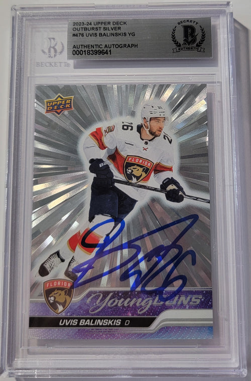 This 2023-24 Upper Deck Young Guns Trading Card #476 was personally hand signed by Uvis Balinskis in blue marker. The Autograph is Authenticated and encapsulated by Beckett. Domestic ground shipping for this item is FREE to the contiguous 48 states. Please contact us for International and other shipping options.