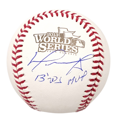 This 2013 World Series Baseball was personally hand signed by David Ortiz in blue ball point pen with "13 WS MVP". The Baseball was signed in the presence of a Beckett Authentication Services Representative and comes affixed with a individual numbered witnessed hologram. The Baseball also comes with a Famous Ink and David Ortiz holograms guaranteeing authenticity for life. Domestic ground shipping for this item is FREE to the contiguous 48 states. Please contact us for International and other shipping options.