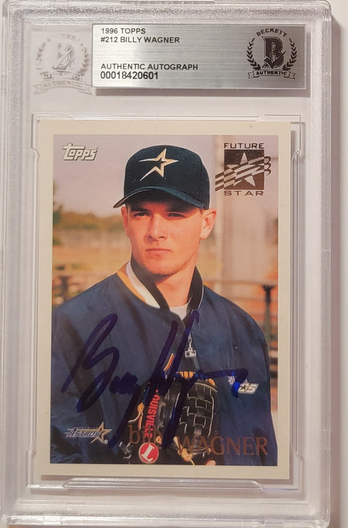 This 1996 Topps Rookie Trading Card #212 was personally hand signed by Billy Wagner in blue marker. The Card was Authenticated and encapsulated by Beckett. Domestic ground shipping for this item is FREE to the contiguous 48 states. Please contact us for International and other shipping options.