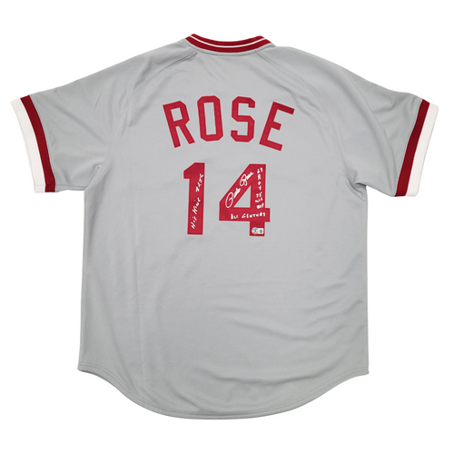 This Mitchell & Ness Authentic Jersey was personally hand signed by Pete Rose in silver paint marker with the inscriptions "63 ROY,75 WS MVP,Hit King 4256,All Century". The Jersey was signed in the presence of a Beckett Authentication Services Representative and comes affixed with a witnessed individual numbered tamper-evident hologram. The Jersey also comes with a Famous ink hologram guaranteeing authenticity for life. Domestic ground shipping for this item is FREE to the contiguous 48 states. Please contact us for International and other shipping options.