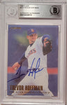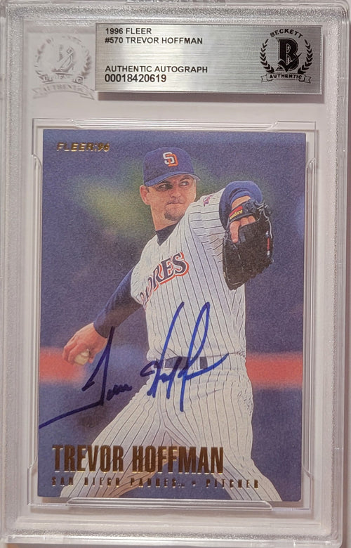 This 1996 Fleer Trading Card #570 was personally hand signed by Trevor Hoffman in blue marker. The Card was Authenticated and encapsulated by Beckett. Domestic ground shipping for this item is FREE to the contiguous 48 states. Please contact us for International and other shipping options.