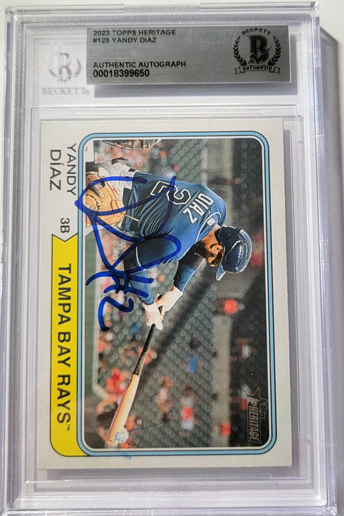 This 2023 Topps Heritage Trading Card #125 was personally hand signed by Yandy Diaz in blue marker. The Autograph is Authenticated and encapsulated by Beckett. Domestic ground shipping for this item is FREE to the contiguous 48 states. Please contact us for International and other shipping options.