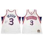 This Mitchell & Ness Swingman Jersey was personally hand signed by Allen Iverson in black marker on the Jersey with the inscription "The Answer". The Jersey was signed in the presence of a Beckett Authentication Services Representative and comes affixed with a witnessed individual numbered tamper-evident Hologram. The Jersey also comes with a Famous ink hologram guaranteeing authenticity for life. Domestic ground shipping for this item is FREE to the contiguous 48 states. Please contact us for International and other shipping options.