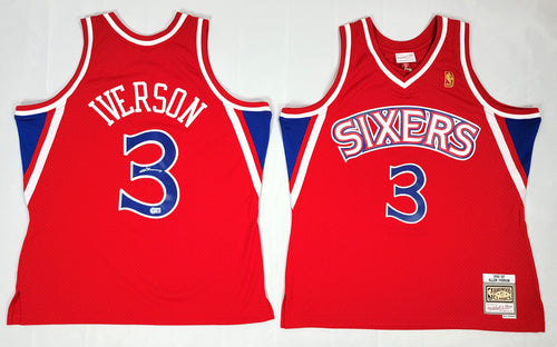This Mitchell & Ness Jersey was personally hand signed by Allen Iverson in silver marker. The Jersey was signed in the presence of a Beckett Authentication Services Representative and comes affixed with a witnessed individual numbered tamper-evident Hologram. The Jersey also comes with a Famous Ink hologram guaranteeing authenticity for life. Domestic ground shipping for this item is FREE to the contiguous 48 states. Please contact us for International and other shipping options.
