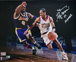 This Licensed 16x20 Photo was personally hand signed by Allen Iverson in white paint marker with " The Answer vs Mamba". The Photo was signed in the presence of a Beckett Authentication Services Representative and comes affixed with a witnessed individual numbered tamper-evident hologram. The Photo also comes with a Famous Ink hologram guaranteeing authenticity for life. Domestic ground shipping for this item is FREE to the contiguous 48 states. Please contact us for International and other shipping options.