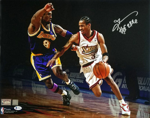 This Licensed 16x20 was personally hand signed by Allen Iverson in white paint marker with the inscription "HOF2K16". The Photo was signed in the presence of a Beckett Authentication Services Representative and comes affixed with a witnessed individual numbered tamper-evident sticker and matching Certificate of Authenticity card. The Photo also comes with a Famousink hologram guaranteeing authenticity for life. Domestic ground shipping for this item is FREE to the contiguous 48 states. Please contact us for International and other shipping options.