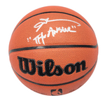 This Wilson NBA Authentic Series Indoor/Outdoor basketball was personally hand signed by Allen Iverson in silver paint marker with the inscription "The Answer". The Basketball was signed in the presence of a Beckett Authentication Services Representative and comes affixed with a witnessed individual numbered tamper-evident hologram. The Basketball also comes with a Famous Ink hologram guaranteeing authenticity for life. Domestic ground shipping for this item is FREE to the contiguous 48 states. Please contact us for International and other shipping options.