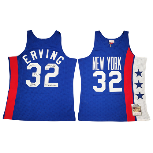 This Mitchell & Ness Swingman Jersey was personally hand signed by Julius Erving in black marker with "74/75/76 ABA MVP & 74&76 ABA Champ". The Jersey was signed in the presence of a Beckett Authentication Services Representative and comes affixed with a witnessed individual numbered tamper-evident hologram. The Jersey also comes with a Famous Ink hologram guaranteeing authenticity for life. Domestic ground shipping for this item is FREE to the contiguous 48 states. Please contact us for International and other shipping options.