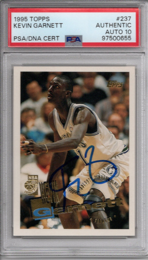 This 1995 Topps Trading Card was personally hand signed by Kevin Garnett in blue marker. The Card is GRADED Authentic AUTO 10 and encapsulated by PSA. Domestic ground shipping for this item is FREE to the contiguous 48 states. Please contact us for International and other shipping options.