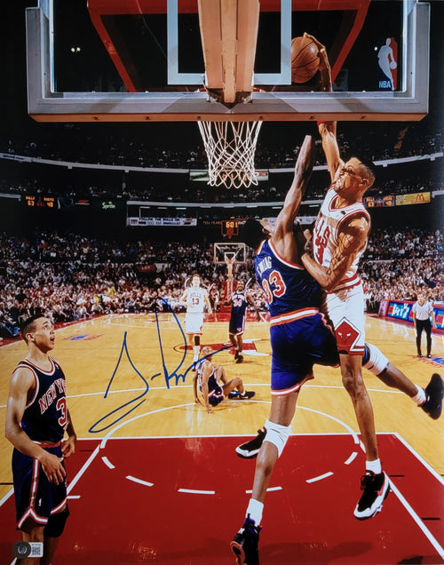 This 16x20 Photo was personally hand signed by Scottie Pippen in blue marker. The Photo was signed in the presence of a Beckett Authentication Services Representative and comes affixed with a witnessed individual numbered tamper-evident hologram. The Photo also comes with a Famous Ink hologram guaranteeing authenticity for life. Domestic ground shipping for this item is FREE to the contiguous 48 states. Please contact us for International and other shipping options.