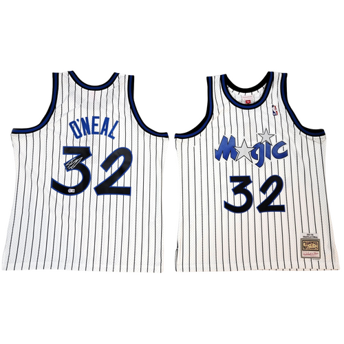 This Mitchell & Ness Swingman Jersey was personally hand signed by Shaquille O'Neal in silver paint marker. The Jersey was signed in the presence of a Beckett Authentication Services Representative and comes affixed with a witnessed individual numbered tamper-evident hologram. The Jersey also comes with a Famous Ink hologram guaranteeing authenticity for life. Domestic ground shipping for this item is FREE to the contiguous 48 states. Please contact us for International and other shipping options.