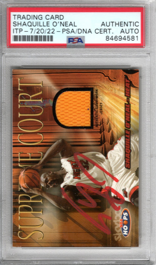 This 2005 Fleer Game Worn Jersey Trading Card was personally hand signed by Shaquille O'Neal in red paint marker. The Card is AUTO GRADED GEM MINT 10 and encapsulated by PSA/DNA. Domestic ground shipping for this item is FREE to the contiguous 48 states. Please contact us for International and other shipping options.