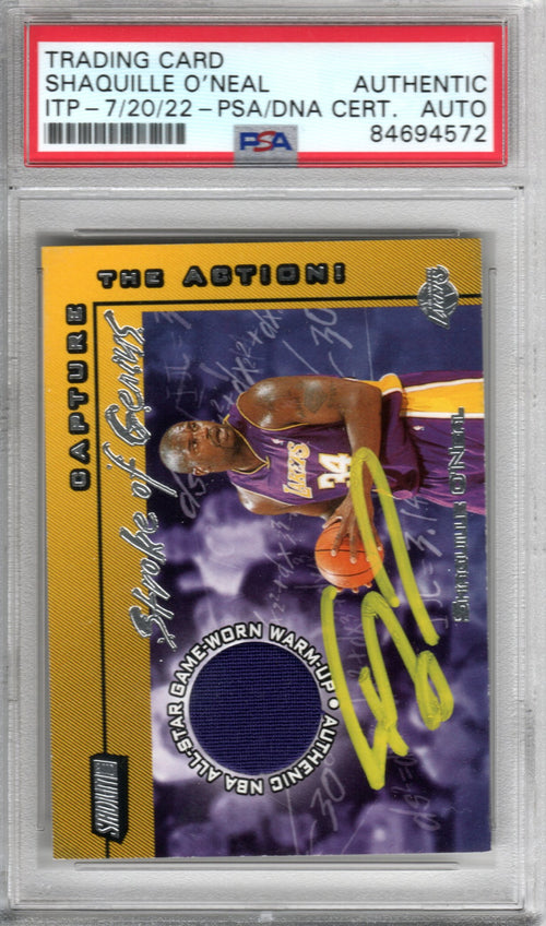 This 2001 Topps All Star Game Worn Warm Up Trading Card was personally hand signed by Shaquille O'Neal in yellow paint marker. The Card is AUTO GRADED GEM MINT 10 and encapsulated by PSA/DNA. Domestic ground shipping for this item is FREE to the contiguous 48 states. Please contact us for International and other shipping options.