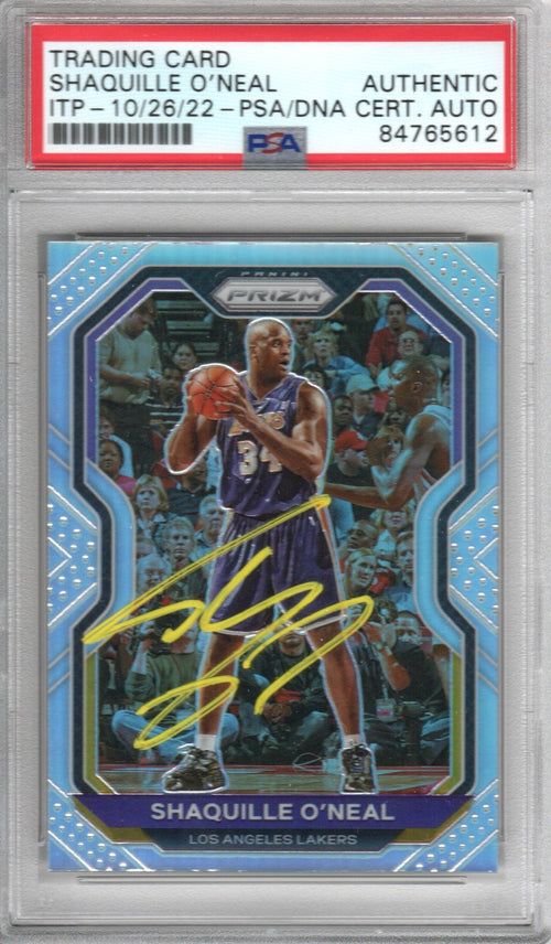 This 2020-21 Panini Prizm Trading Card was personally hand signed by Shaquille O'Neal in yellow paint marker. The Card was signed in the presence of a PSA representative and encapsulated by PSA. Domestic ground shipping for this item is FREE to the contiguous 48 states. Please contact us for International and other shipping options.