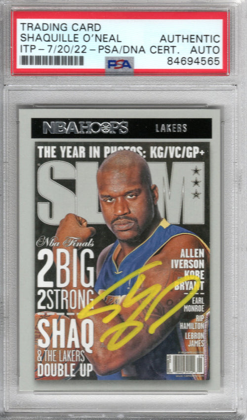 This 2020 Panini Slam NBA Hoops Trading Card was personally hand signed by Shaquille O'Neal in yellow paint marker. The Card is Authenticated and encapsulated by PSA/DNA. Domestic ground shipping for this item is FREE to the contiguous 48 states. Please contact us for International and other shipping options.