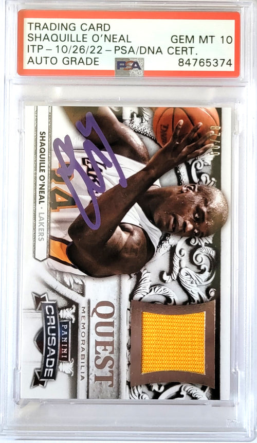 This 2012-13 Panini Trading Card was personally hand signed by Shaquille O'Neal in purple paint marker. The Autograph is Graded GEM MT. 10. The Card was signed in the presence of a PSA representative and encapsulated by PSA. Domestic ground shipping for this item is FREE to the contiguous 48 states. Please contact us for International and other shipping options.