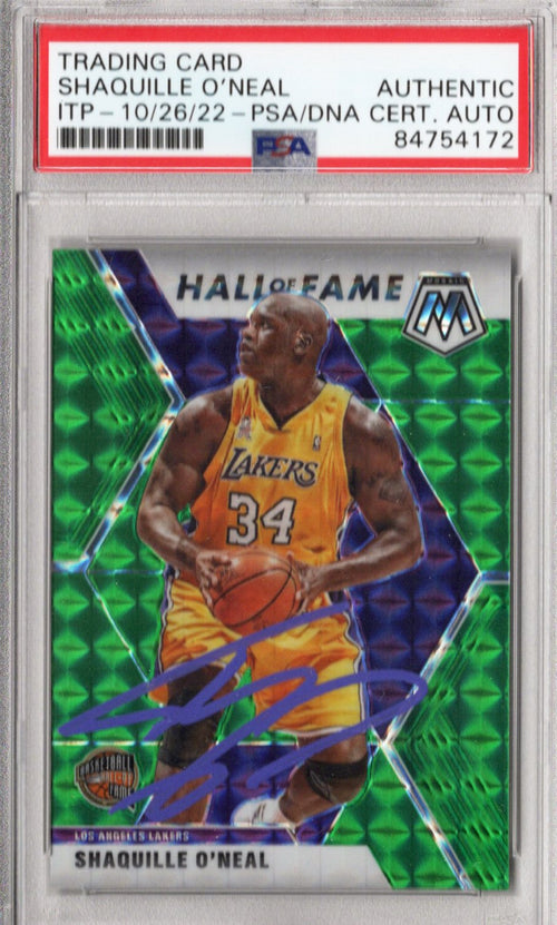 This Trading Card was personally hand signed by Shaquille O'Neal in purple paint marker. The Card is Authenticated and encapsulated by PSA/DNA. Domestic ground shipping for this item is FREE to the contiguous 48 states. Please contact us for International and other shipping options.