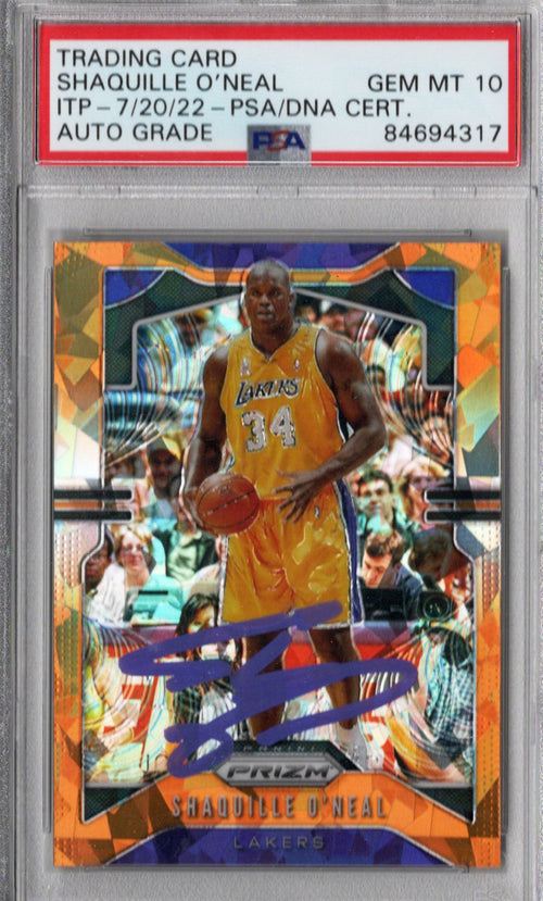 This 2019-20 Panini Prizm Trading Card was personally hand signed by Shaquille O'Neal in purple paint marker. The Autograph is Graded GEM MT. 10. The Card was signed in the presence of a PSA representative and encapsulated by PSA. Domestic ground shipping for this item is FREE to the contiguous 48 states. Please contact us for International and other shipping options.
