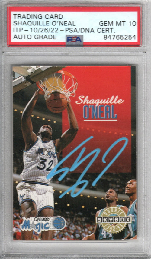 This 1992-93 Sky Box Trading Card was personally hand signed by Shaquille O'Neal in blue paint marker. The Autograph is Graded GEM MT. 10. The Card was signed in the presence of a PSA representative and encapsulated by PSA. Domestic ground shipping for this item is FREE to the contiguous 48 states. Please contact us for International and other shipping options.