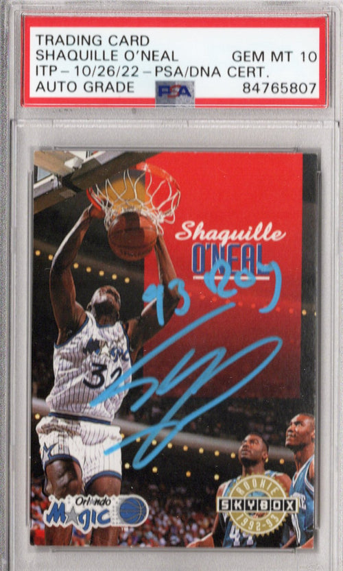 This 1992-93 SkyBox Trading Card was personally hand signed by Shaquille O'Neal in blue paint marker. The Card is AUTO GRADE GEM MT 10 and encapsulated by PSA/DNA. Domestic ground shipping for this item is FREE to the contiguous 48 states. Please contact us for International and other shipping options.