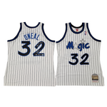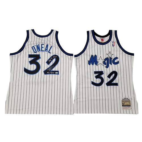 This Mitchell & Ness Swingman Jersey was personally hand signed by Shaquille O'Neal in silver marker with the inscriptions "92 #1 Pick & 93 ROY". The Jersey was signed in the presence of a PSA/DNA Representative and comes affixed with a witnessed individual numbered tamper-evident hologram and matching Certificate of Authenticity . The Jersey also comes with a Famous Ink hologram guaranteeing authenticity for life. Domestic ground shipping for this item is FREE to the contiguous 48 states. Please contact us for International and other shipping options.