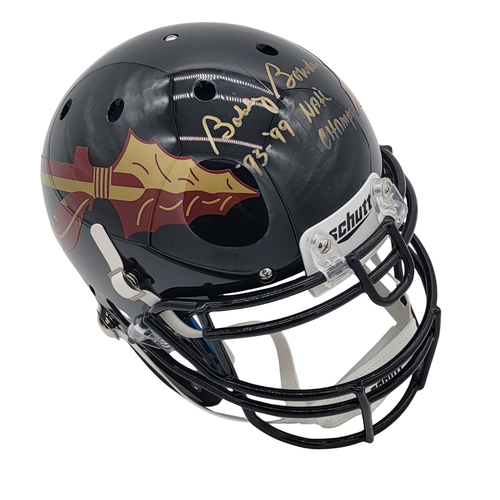 This Schutt Authentic Black Helmet was personally hand signed by Bobby Bowden in gold paint marker with the inscriptions "93-'99 National Champs". The Helmet was signed in the presence of a Beckett Authentication Services Representative and comes affixed with a witnessed individual numbered tamper-evident sticker and matching Certificate of Authenticity card. The Helmet also comes with a Famousink hologram guaranteeing authenticity for life. Domestic ground shipping for this item is FREE to the contiguous 48 states. Please contact us for International and other shipping options.