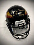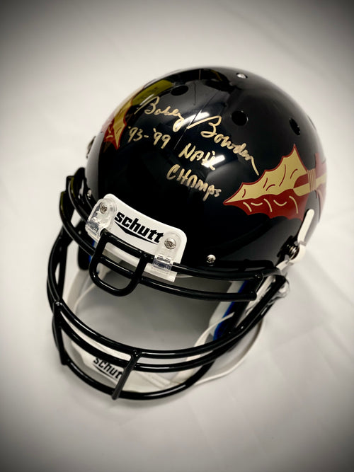 This Schutt Authentic Black Helmet was personally hand signed by Bobby Bowden in gold paint marker with the inscriptions "93-'99 National Champs". The Helmet was signed in the presence of a Beckett Authentication Services Representative and comes affixed with a witnessed individual numbered tamper-evident sticker and matching Certificate of Authenticity card. The Helmet also comes with a Famousink hologram guaranteeing authenticity for life. Domestic ground shipping for this item is FREE to the contiguous 48 states. Please contact us for International and other shipping options.