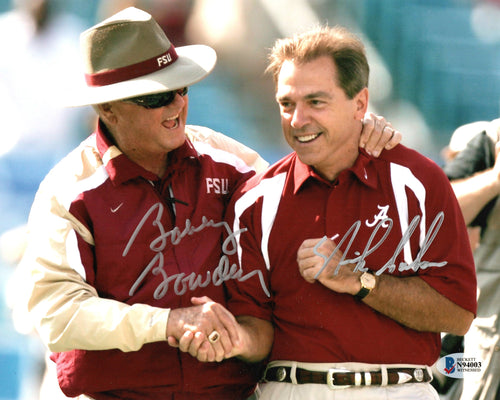 This 8x10 photo was personally hand signed by Bobby Bowden and Nick Saban in silver marker. The photo was signed in the presence of a Beckett Authentication Services Representative and comes affixed with a witnessed individual numbered tamper-evident sticker and matching Certificate of Authenticity card. The photo also comes with a Famous Ink hologram guaranteeing authenticity for life. Domestic ground shipping for this item is FREE to the contiguous 48 states. Please contact us for International and other shipping options.