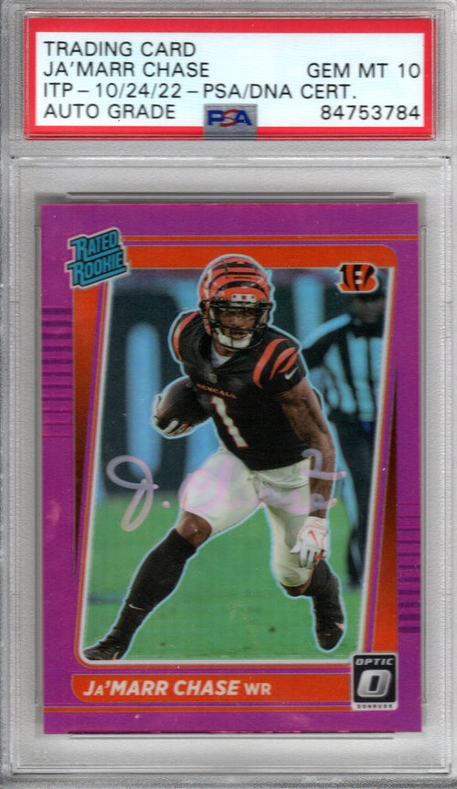 This 2021 Panini Trading Card was personally hand signed by Ja'Marr Chase in pink paint marker. The card is AUTO Grade GEM MT 10. The Card was signed in the presence of a PSA representative and encapsulated by PSA. Domestic ground shipping for this item is FREE to the contiguous 48 states. Please contact us for International and other shipping options.