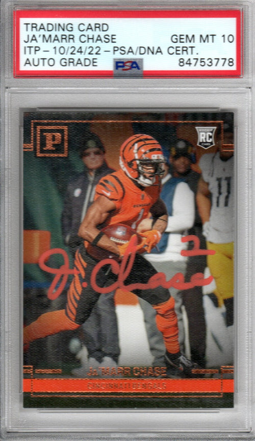 This 2021 Panini Trading Card was personally hand signed by Ja'Marr Chase in orange paint marker. The Autograph is Graded GEM MT. 10. The Card was signed in the presence of a PSA representative and encapsulated...