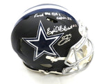This Riddell Flat Matte Black Speed Replica Helmet was personally hand signed by Emmitt Smith and Ezekiel Elliott in white paint marker with the inscription "Feed Me Till I catch 22". The Helmet was signed in the presence of a Beckett Authentication Services Representative and comes affixed with a witnessed individual numbered tamper-evident sticker and matching Certificate of Authenticity card. The Helmet also comes with a Famousink hologram guaranteeing authenticity for life. Domestic ground shipping for this item is FREE to the contiguous 48 states. Please contact us for International and other shipping options.