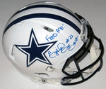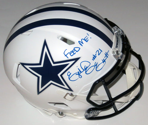 This Riddell Matte White Speed Authentic Helmet was personally hand signed by Ezekiel Elliott in Blue paint marker with the inscription "Feed Me". The Helmet was signed in the presence of a Beckett Authentication Services Representative and comes affixed with a individual numbered tamper-evident sticker and Certificate of Authenticity. The Helmet also comes with a Famousink hologram guaranteeing authenticity for life. Domestic ground shipping for this item is FREE to the contiguous 48 states. Please contact us for International and other shipping options.