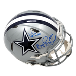 This Authentic Speed Helmet was personally hand signed by Dak Prescott & Ezekiel Elliott in blue paint marker. The Helmet was signed in the presence of a Beckett Authentication Services Representative and comes affixed with a witnessed individual numbered tamper-evident sticker and matching Certificate of Authenticity card. The Helmet also comes with a Famous Ink hologram guaranteeing authenticity for life. Domestic ground shipping for this item is FREE to the contiguous 48 states. Please contact us for International and other shipping options.