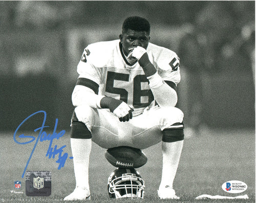 This Licensed 8x10 was personally hand signed by Lawrence Taylor in blue paint marker with the inscription "HOF 99". The Photo was signed in the presence of a Beckett Authentication Services Representative and comes affixed with a witnessed individual numbered tamper-evident sticker and matching Certificate of Authenticity card. The Photo also comes with a Famousink hologram guaranteeing authenticity for life. Domestic ground shipping for this item is FREE to the contiguous 48 states. Please contact us for International and other shipping options.