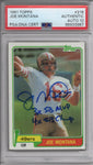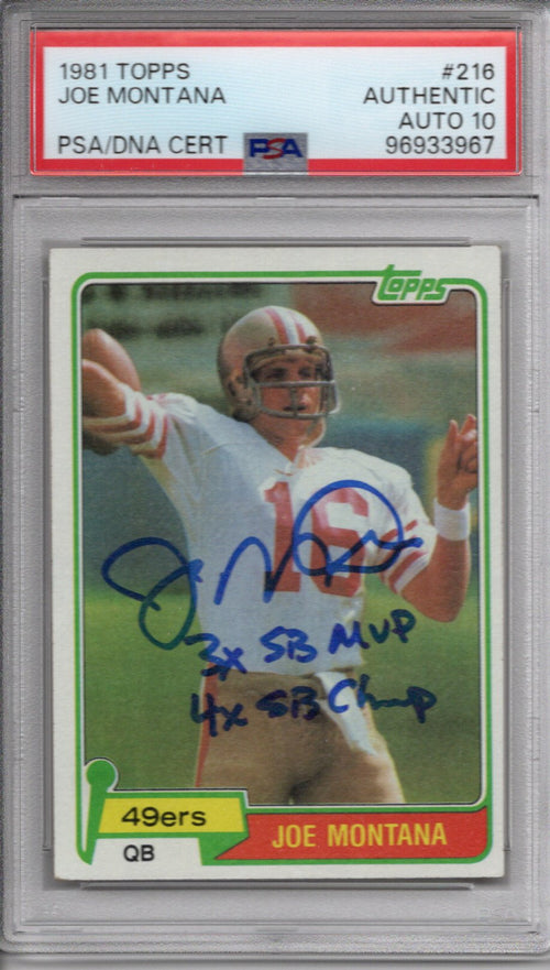 This 1981 Topps Trading Card was personally hand signed by Joe Montana in blue marker with 3X SB MVP & 4X SB Champ. The Card is GRADED AUTHENTIC AUTO 10 and encapsulated by PSA. Domestic ground shipping for this item is FREE to the contiguous 48 states. Please contact us for International and other shipping options.