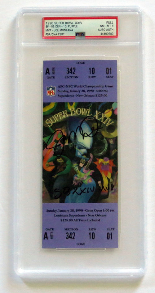 This encapsulated Ticket is from Super Bowl XXIV and was personally hand signed by Joe Montana in black marker with inscription "SB XXIV MVP". The ticket is encapsulated,authenticated and graded NM MT 8 by PSA/DNA. Domestic ground shipping for this item is FREE to the contiguous 48 states. Please contact us for International and other shipping options.