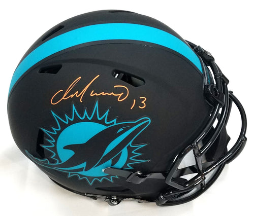 This Riddell Authentic Eclipse Helmet was personally hand signed by Dan Marino in orange paint marker. The Helmet was signed in the presence of a Beckett Authentication Services Representative and comes affixed with a witnessed individual numbered tamper-evident sticker and matching Certificate of Authenticity card. The Helmet also comes with a Famous Ink hologram guaranteeing authenticity for life. Domestic ground shipping for this item is FREE to the contiguous 48 states. Please contact us for International and other shipping options.