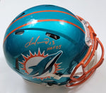 This Flash Authentic Helmet was personally hand signed by Dan Marino in orange paint marker with the inscription "HOF 05". The Helmet was signed in the presence of a Beckett Authentication Services Representative and comes affixed with a witnessed individual numbered tamper-evident hologram. The Helmet also comes with a Famous Ink hologram guaranteeing authenticity for life. Domestic ground shipping for this item is FREE to the contiguous 48 states. Please contact us for International and other shipping options.